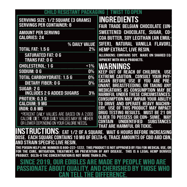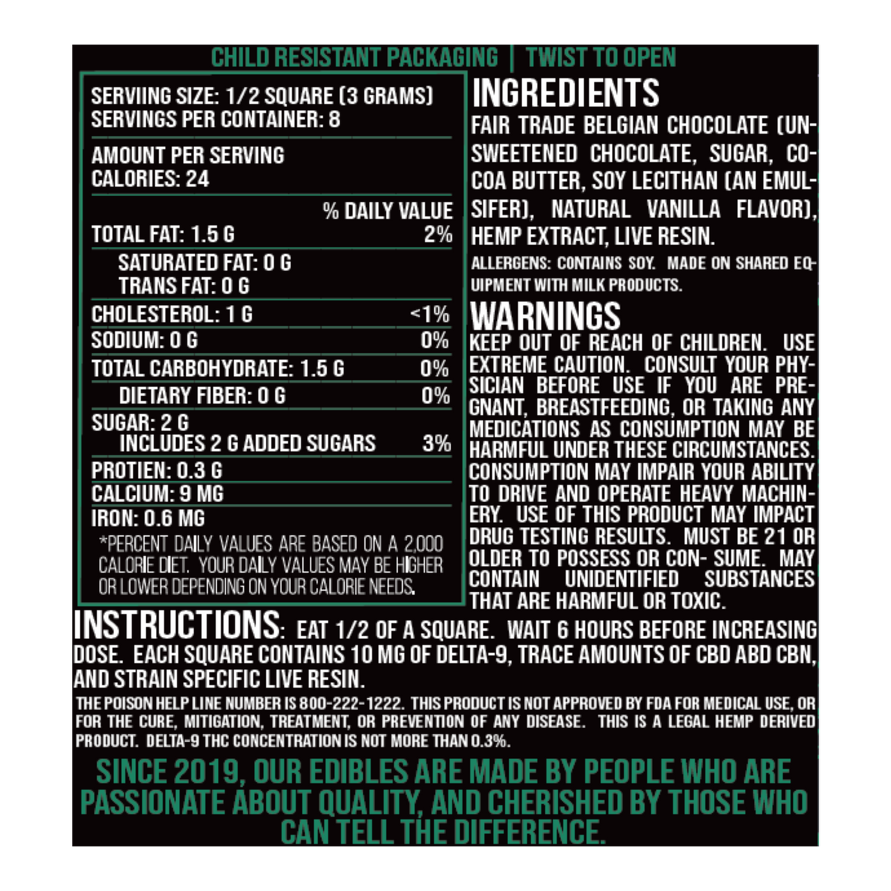 This live resin indica dark chocolate will have you cozy all night long. The perfect chocolate to add to your wind down routine!