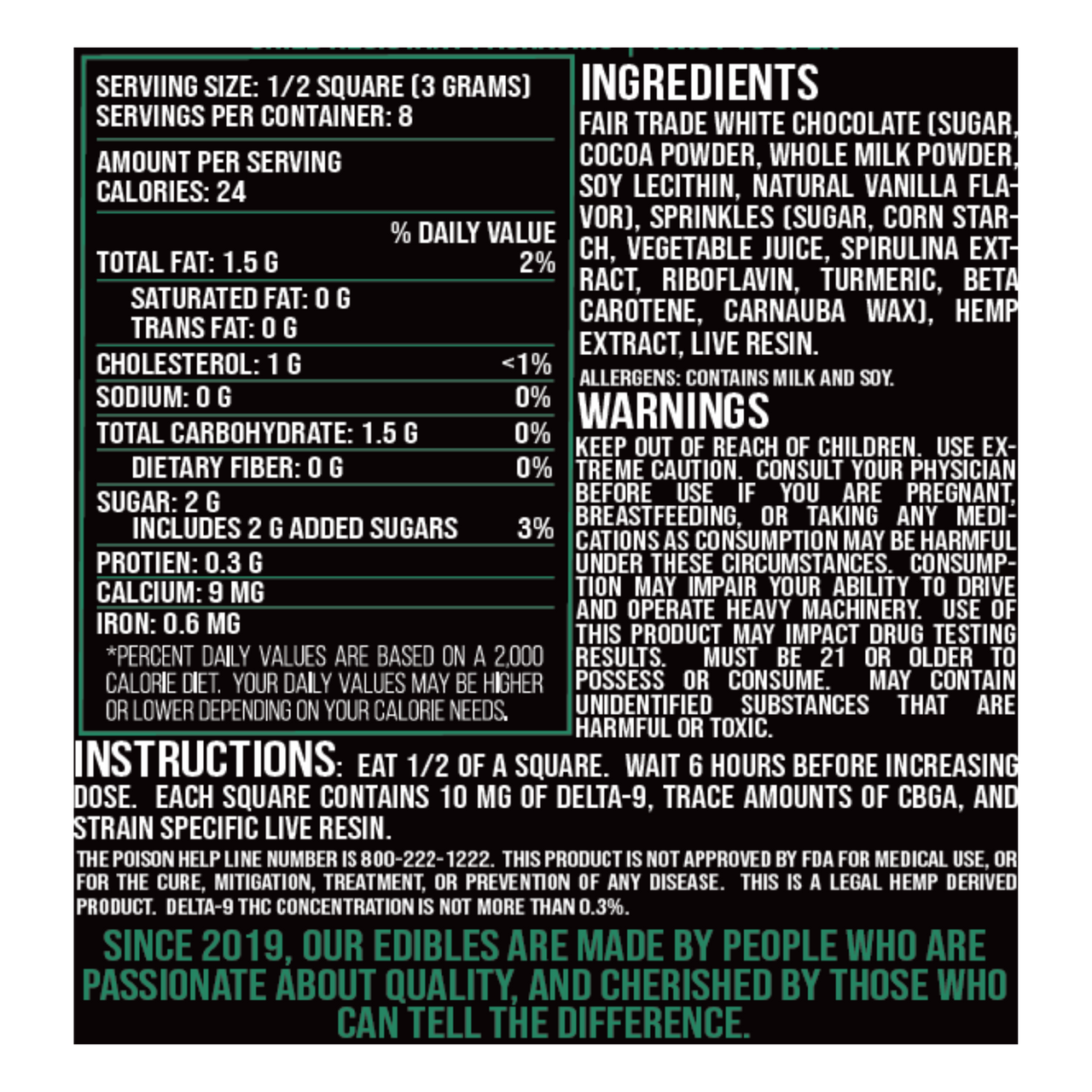 Everything is better with sprinkles! This live resin hybrid white chocolate is the perfect treat companion for any time of day.