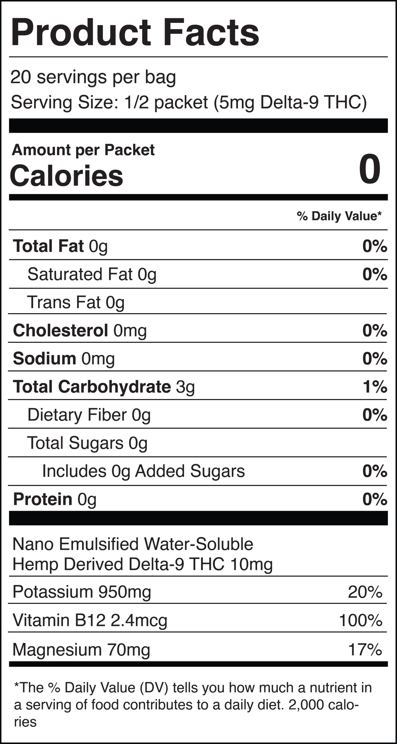 Allulose, Potassium Citrate, Citric Acid, Magnesium Glycinate, Nano-Emulsified Water-Soluble Hemp Derived Delta-9 THC, Vitamin B-12.