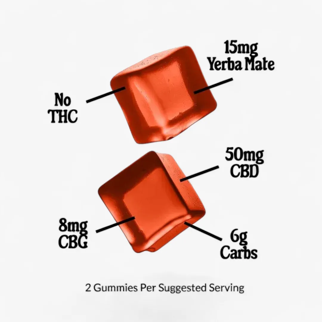 Ingredients: Calcium, Potassium, Niacin, Vitamin B12, Vitamin B6, Vitamin C, Organic Yerba Mate, Cannabidiol (CBD), Cannabigerol (CBG), Organic Cane Sugar, Water, Organic Tapioca Syrup, Fruit Pectin, Citric Acid, Natural Flavors,