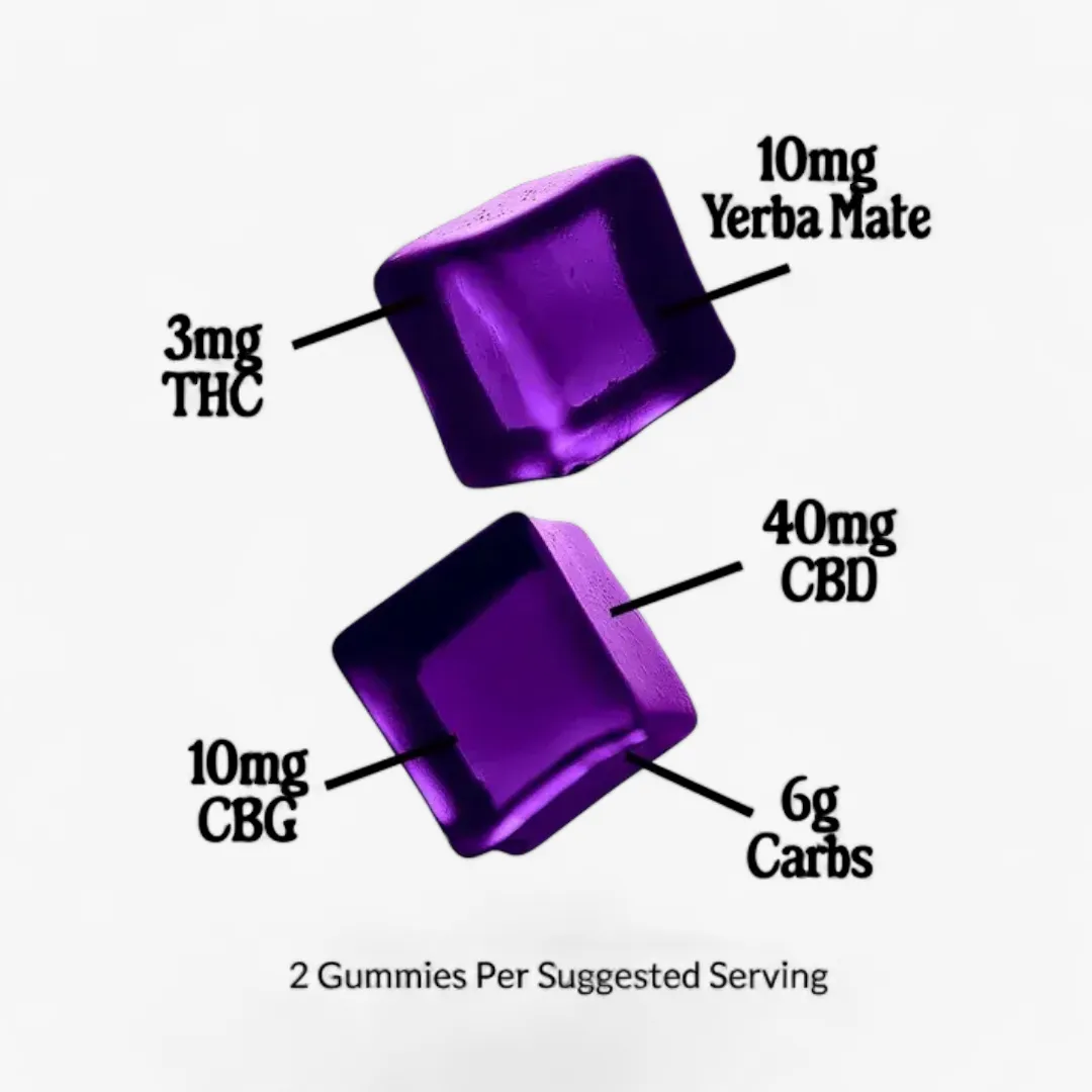 Ingredients: Calcium, Potassium, Niacin, Vitamin B12, Vitamin B6, Vitamin C, Organic Yerba Mate, Tetrahydrocannabinol (THC), Cannabidiol (CBD), Cannabigerol (CBG), Organic Cane Sugar, Water, Organic Tapioca Syrup, Fruit Pectin, Citric Acid, Natural Flavors.