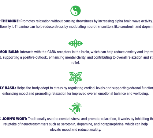 L-Theanine, Lemon Balm, Holy Basil (Tulsi), St. John’s Wort.