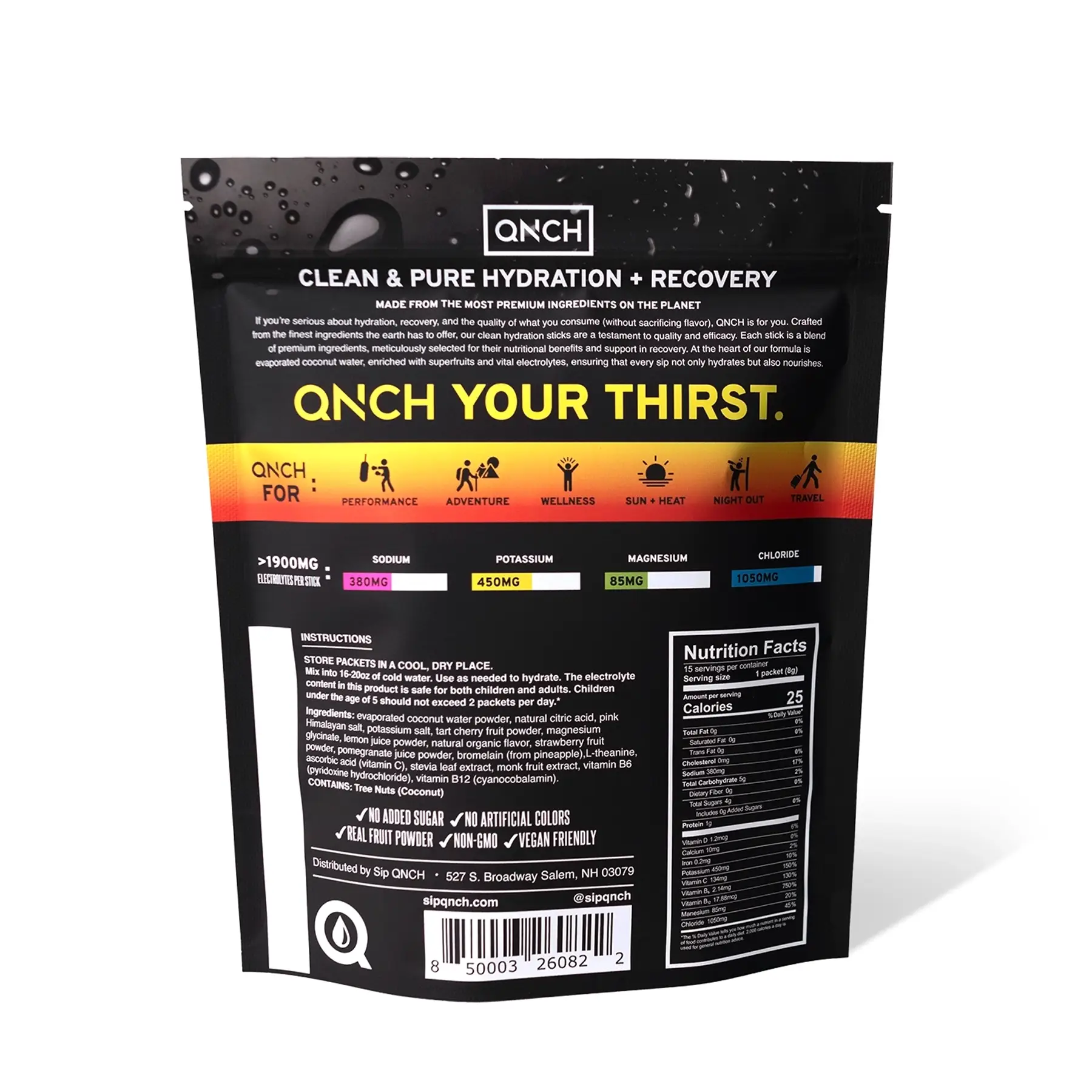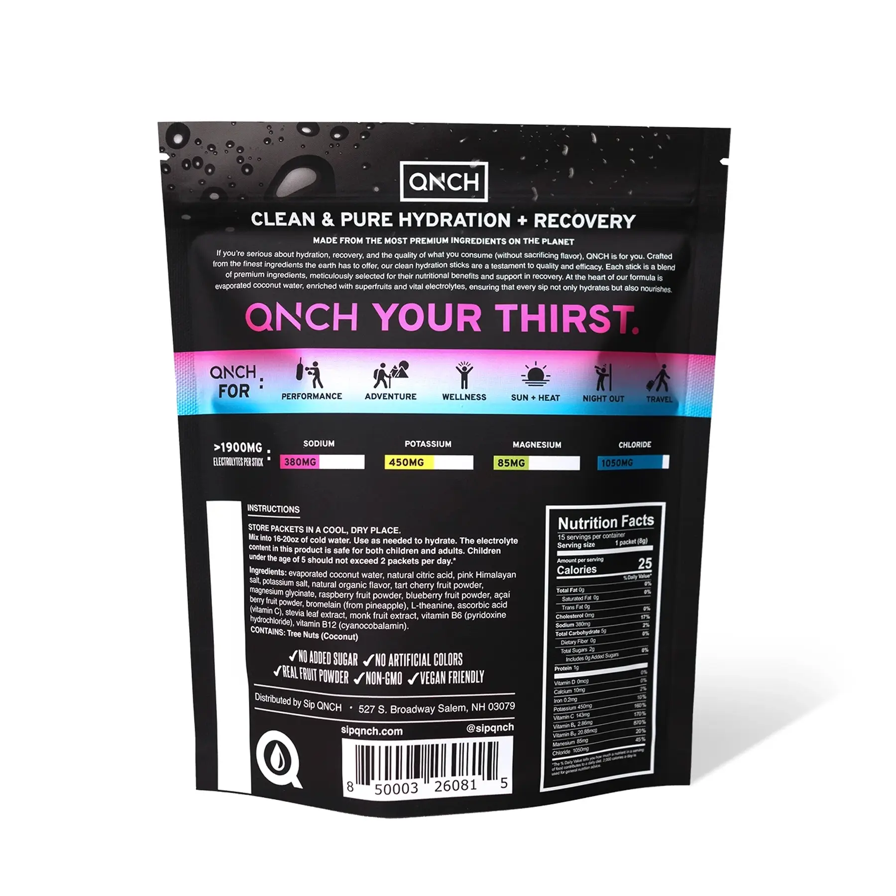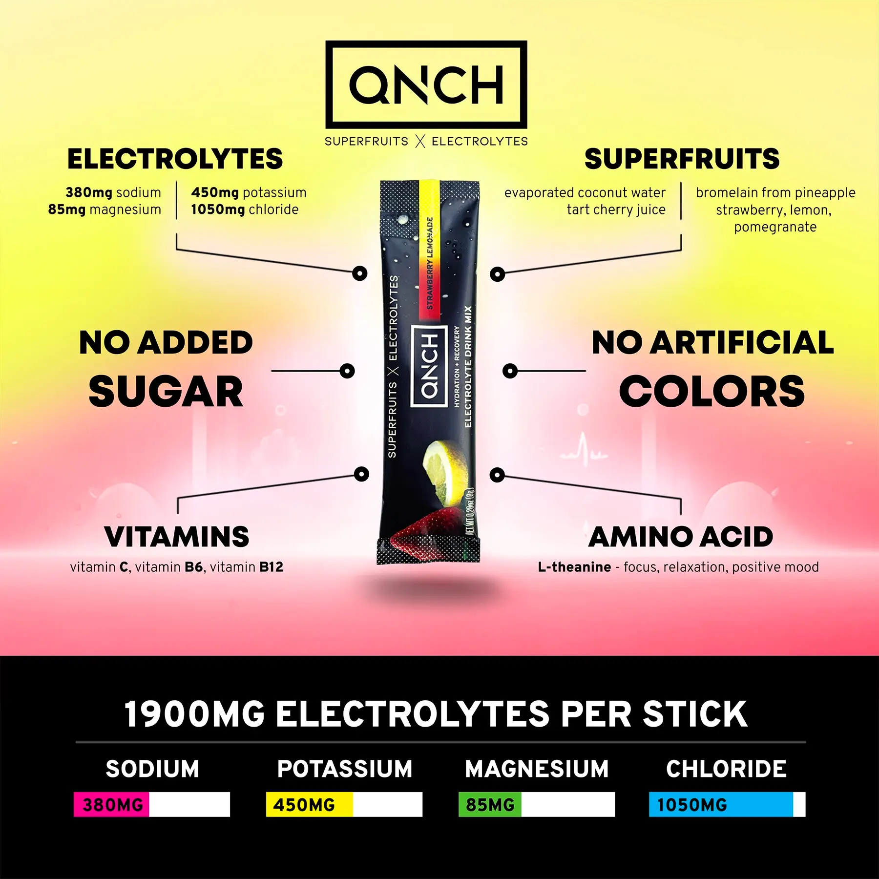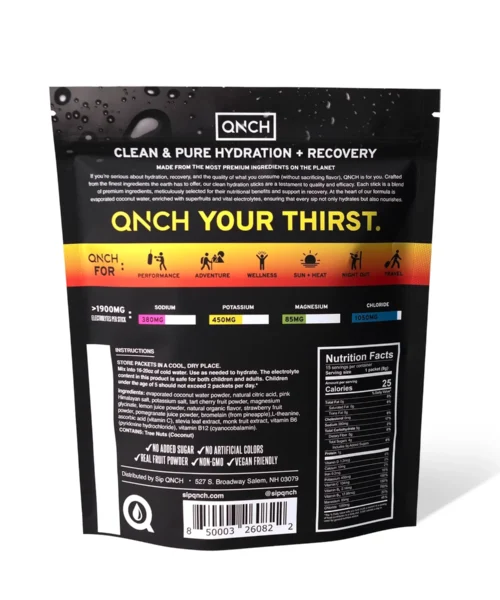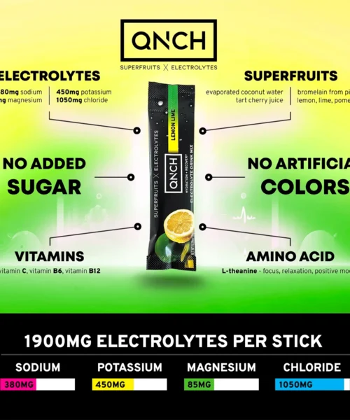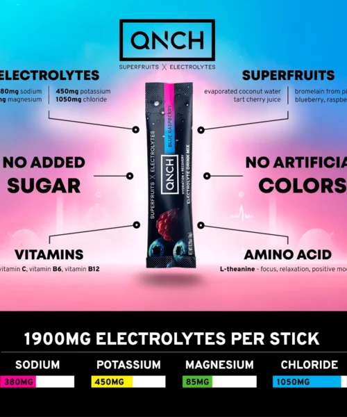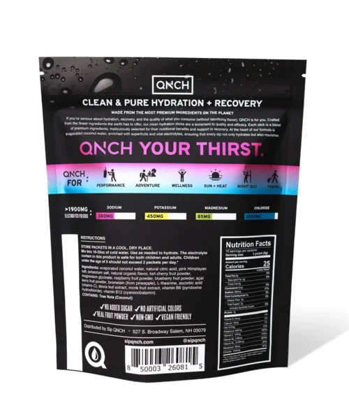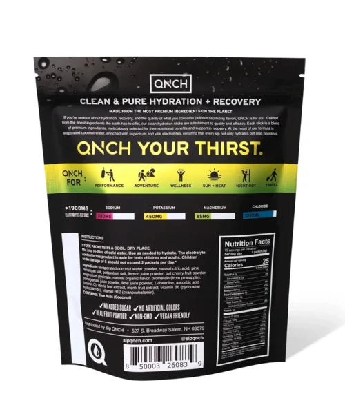 Qnch’s Zero sugar electrolyte powders contain no added sugar. The only sugar present in our hydration powder comes naturally from real dried superfruits used in our formula. QNCH is designed to provide essential electrolytes—such as sodium, potassium, and magnesium—without any added sugars. These electrolyte powders are ideal for individuals seeking to maintain hydration during workouts, recover from illness, or stay hydrated in hot climates without consuming extra calories or sugars.