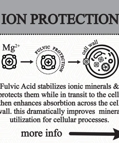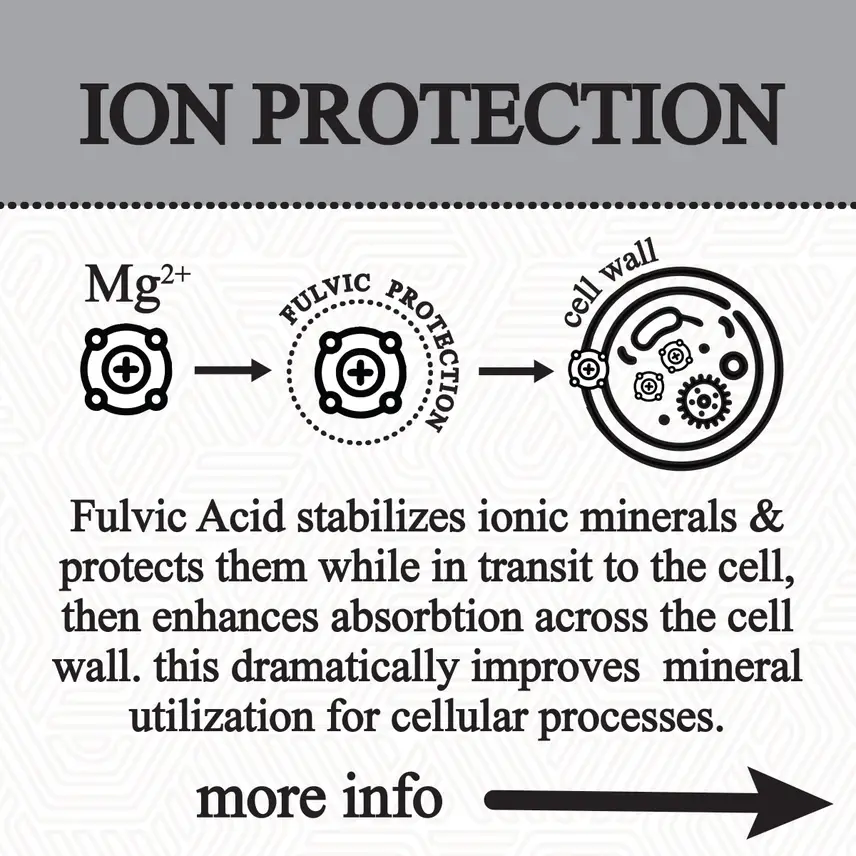 Fulvic Acid stabilizes and protects ionic minerals in transit to the cell and escorts them across the cell wall. Changing envornement inside the cell releases ionic minerals from the fulvic package. This dramatically improves mineral utilization on a cellular level.