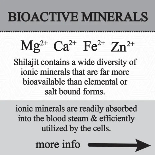 Shilajit has 80+ minerals in their bioavailable ionic form with the addition of fulvic acid that escorts minerals to the cell and releases once across the cell wall.