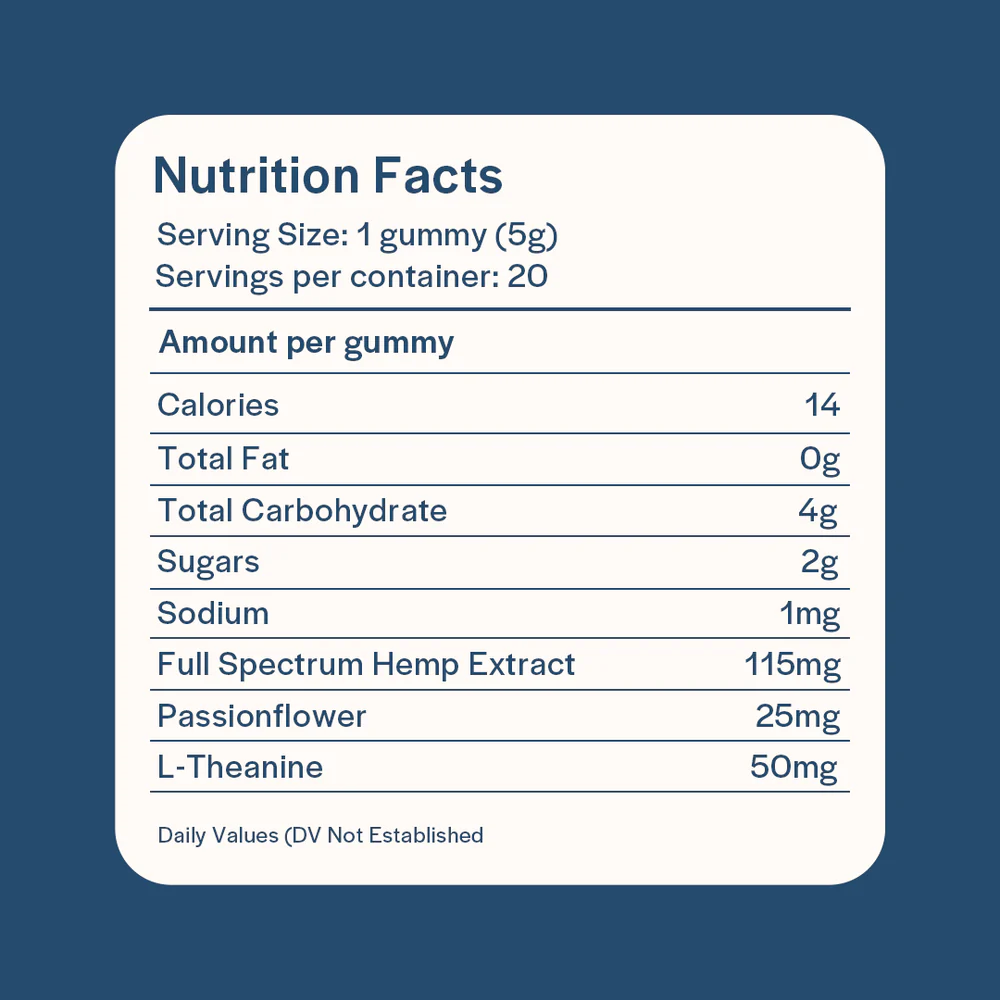Organic Tapioca Syrup, Sugar, Citrus Pectin, Full Spectrum Hemp Extract, L-Theanine, Passionflower, CBN Isolate, Citric Acid, Natural Flavor, Coconut Oil, Natural and Artificial Color, Sunflower Lecithins.
