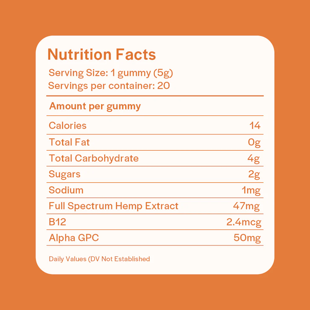 Full List of Ingredients: Organic Tapioca Syrup, Sugar, Citrus Pectin, Alpha GPC, CBG Isolate, Full Spectrum Hemp Extract, B12, Citric Acid, Natural Flavor, Coconut Oil, Natural and Artificial Color, Sunflower Lecithins.