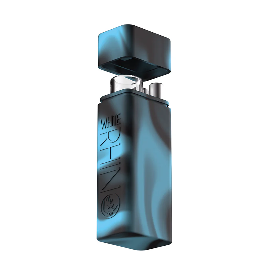 White Rhino Dual is a portable smoking kit for dry herbs. The silicone body holds a glass container for the herbs and two anodized bats, one black and one silver.